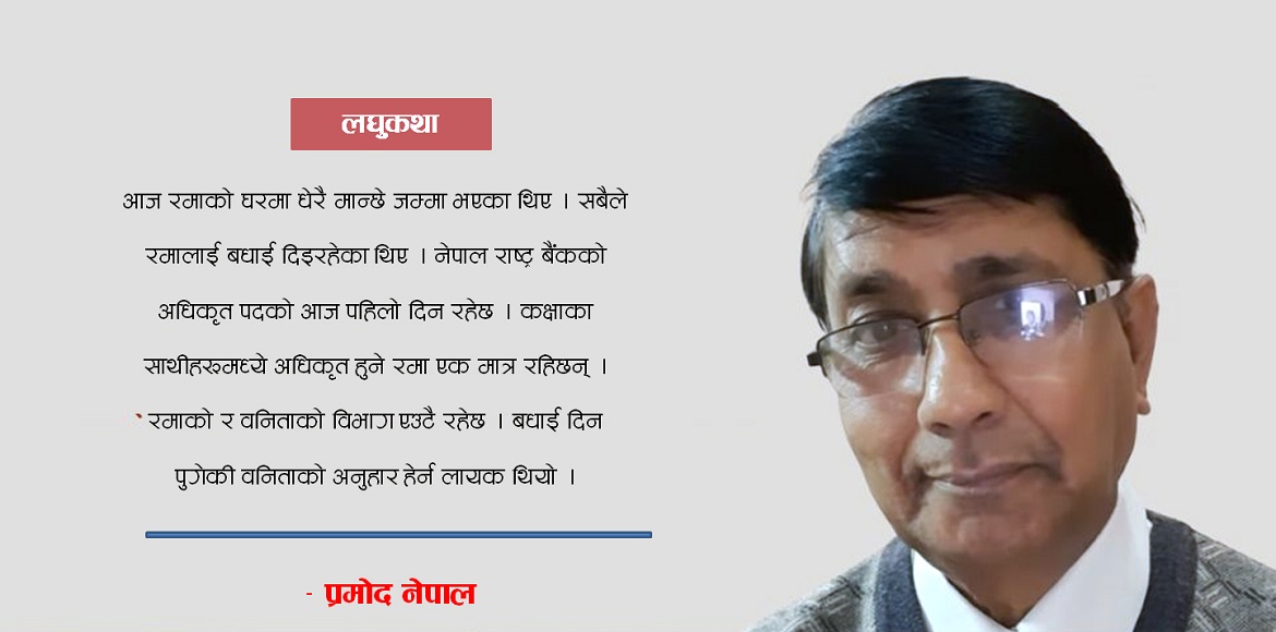 आज रमाको घरमा धेरै मान्छे जम्मा भएका थिए । सबैले रमालाई बधाई दिइरहेका थिए । नेपाल राष्ट्र बैंकको अधिकृत पदको आज पहिलो दिन रहेछ । कक्षाका साथीहरूमध्ये अधिकृत हुने रमा एक मात्र रहिछन् ।